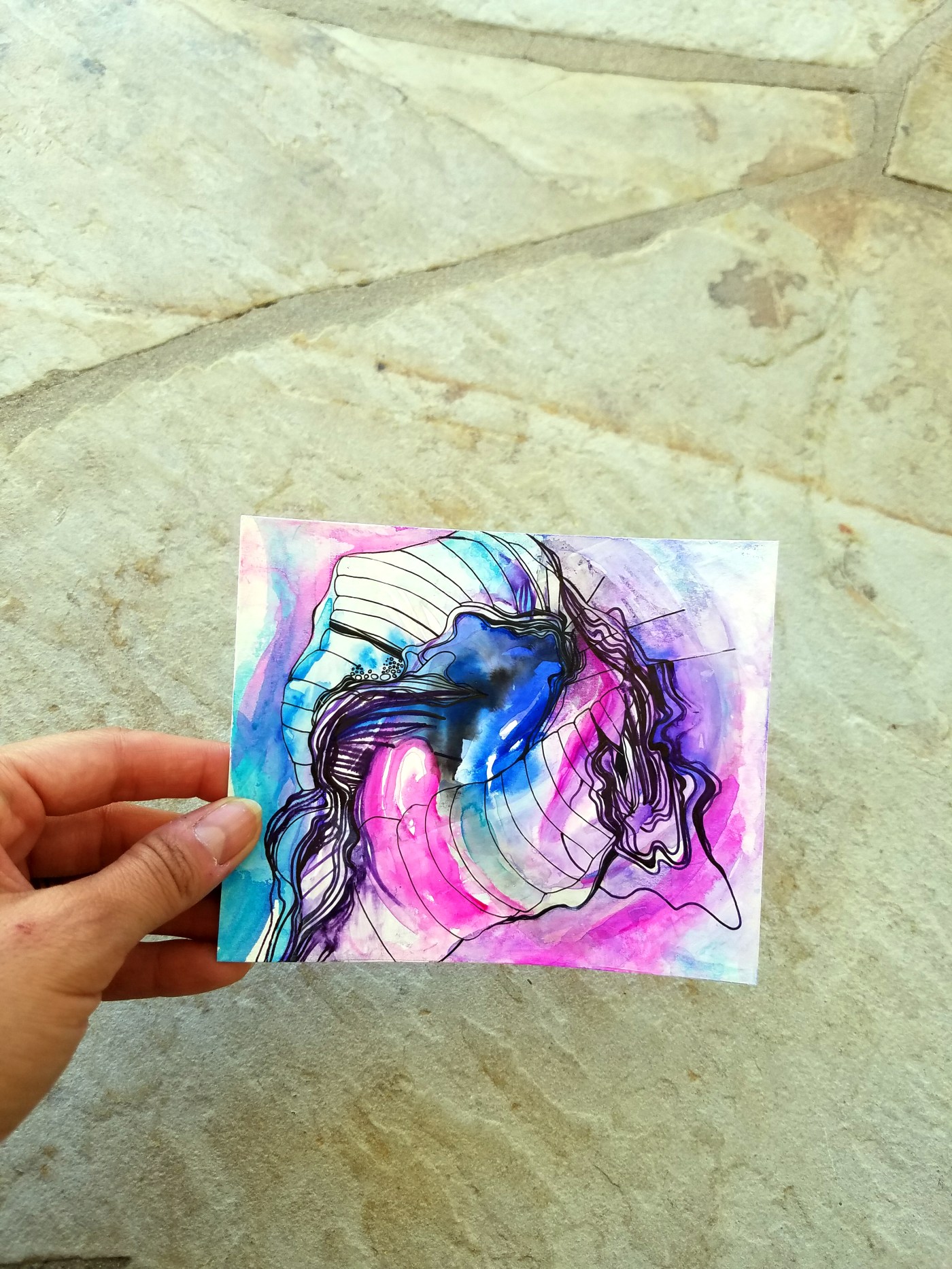 I got this idea to make these tiny pieces using texture paste and acrylic paint. It’s so fun to see how some products mix with each other. It’s a totally different experience to paint on top of the paste and it creates sort of a hazy watercolored background. I am going to cut more of these pieces today to make small little universes like this.
